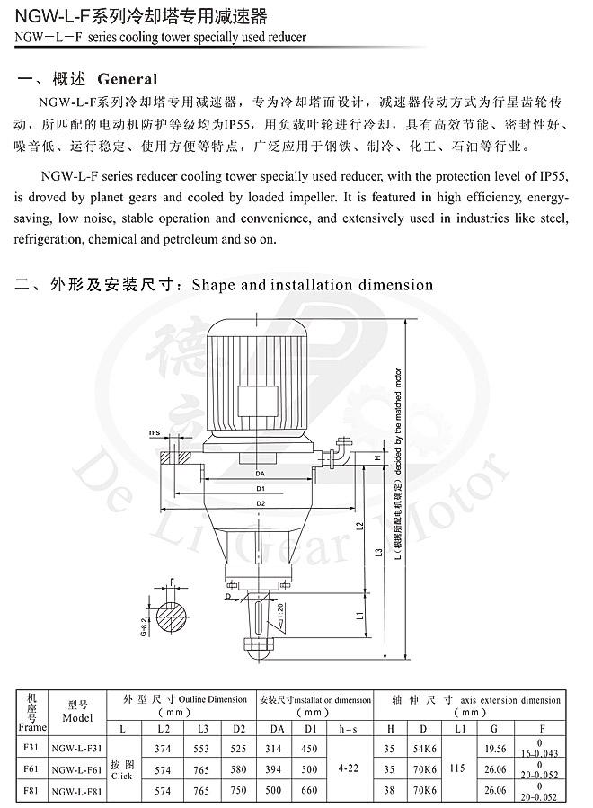 NGW-L-F系列冷卻塔專用減速器系上海交通大學設計,是專門為配套200~750T/n冷卻塔設計的新產品,其主要結構為立式單級行星傳動。齒輪采用合金鋼經高精度切削加工熱處理而成,具有強度高、韌性好、精度高等優點,同時采用浸油式潤滑,且在密封方面作了改進,從而達到了噪音低、振動小、效率高、不漏油、壽命長的目的。己成為冷卻塔節能降噪的最理想產品,被廣泛用于化工、輕工、醫藥、冶金、高級賓館、民用建筑等行業。